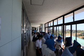 今回の防災訓練は、①避難経路、②安否(点呼)、③非常持出品の確認を重点に行いました。緊急地震速報システムにより、震度5強を想定したカウントダウンを発生合図に生徒は、一斉に机の下に潜り込みました。放送と担任の指示により非難を開始し、指定の避難ルートに沿って静かに速やかに移動しました。東南海地震が心配される中、生徒は、緊張感を持って、いざという時に沈着、冷静に行動できるよう真剣に行動しました。